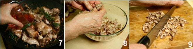 Add a glass of red wine 7 and let it evaporate, then salt, add another glass of wine, and cover the rabbit with a lid, letting it cook over low heat until it starts to fall apart, adding hot broth as needed until the end of cooking. Let the rabbit cool slightly, then, using your hands, debone all the meat 8 (much easier when the rabbit is cooked!), chop it with a knife 9 and add it to its cooking base in the pan 10.
