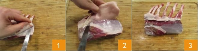 To prepare the rack of lamb with thyme and Colonnata lard, start by trimming the excess fat from the meat. Use a thin and sharp knife, starting from one end 1 and running it along the entire surface of the meat 2. Once it is well trimmed 3