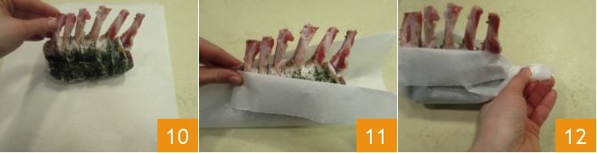 Then transfer it to a sheet of parchment paper 10 and fold the paper to cover only the meat, leaving the bones uncovered 11. Close it like a candy 12.