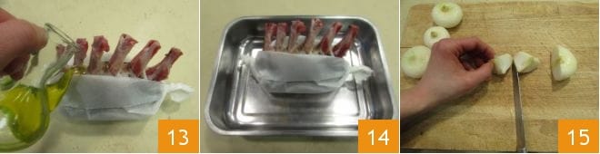 Add a drizzle of oil inside the parcel 13 and place everything in a baking dish 14. Cut the pearl onions into quarters 15 and place them alongside.