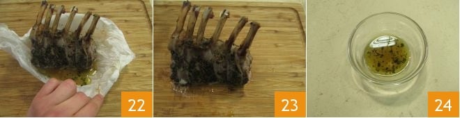 open the parcel 22 and remove the ribs 23, keeping the cooking juices aside 24.