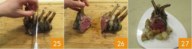 Cut the rack 25 to separate the ribs 26. Then serve your rack of lamb with thyme and lard along with the pearl onions, drizzling everything with the cooking juices 27.