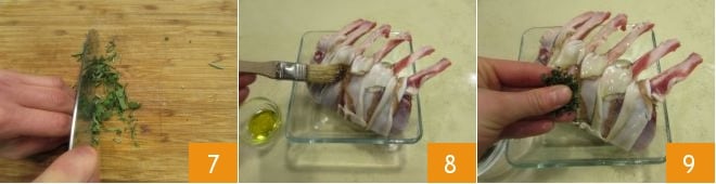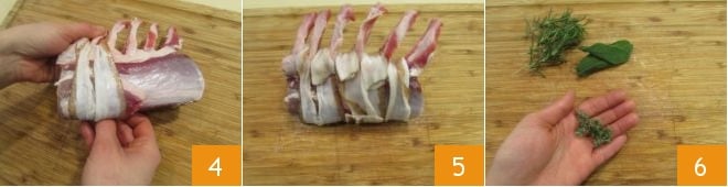 wrap the slices of lard between the various ribs (4-5). If the lard does not adhere, you can lightly grease the meat. Then take the aromatic herbs (thyme, sage, and rosemary) and strip them 6.