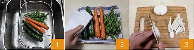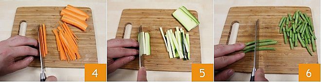 Peel the carrot with a vegetable peeler, cut it in half, slice it lengthwise, and finally form strips 4. Take the zucchini and, without peeling it, cut it into strips like the carrot 5. After cutting the green beans in half 6, set the vegetables aside in small bowls.
