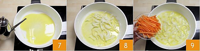 Pour the extra virgin olive oil into a non-stick pan 7 and when the oil is hot, add the scallion wedges 8. Cook for 5-6 minutes over medium heat, adding water to soften it, then add the carrots and cook them for another two minutes only with the scallion 9.