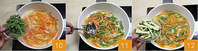 Add the green beans 10, salt, and pepper to taste. Add more water to facilitate cooking 11 and cook over moderate heat for 6 minutes, then add the zucchini 12.