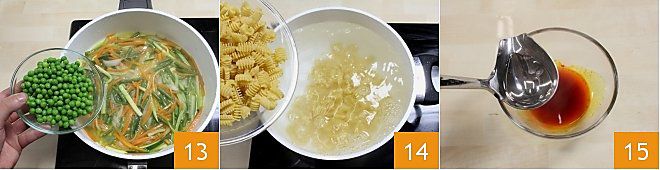 Finally, add the peas 13 and salt and pepper again. Let the vegetables cook for about 15 minutes on low heat until they soften. At this point, bring water to a boil in a pot and once it reaches boiling, add the radiators 14, cook for about 9 minutes. In the meantime, take a small bowl, pour in the saffron packet and add some of the cooking water 15.