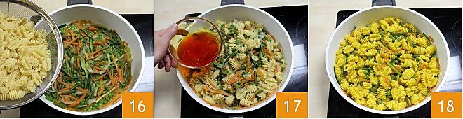 As soon as the radiators are cooked, drain them and pour them into the pan with the vegetables 16, mix everything, amalgamating the pasta with the vegetables. Immediately after, add the saffron dissolved in the cooking water you had prepared 17 and mix. Now your radiators with vegetables and saffron are ready 18 to be plated, served, and enjoyed!