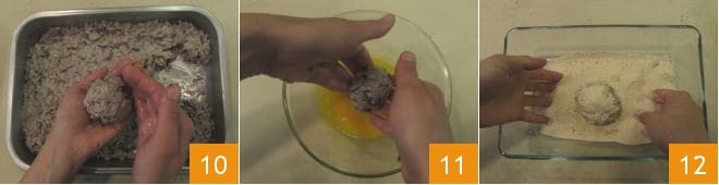 After this time, the rice will be cold and firm, so you can proceed with the recipe: take about 3.5 oz of rice and shape it into a ball 10, then dip it in the beaten eggs 11 and coat with breadcrumbs 12. Continue this way to form all the supplì.