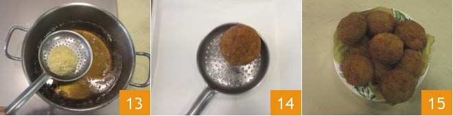 Heat the seed oil in a saucepan to 340°F (measured with a kitchen thermometer) and fry 1 or 2 supplì at a time 13 until golden brown, then drain on a sheet of absorbent paper 14. Serve your radicchio and gorgonzola supplì hot 15!