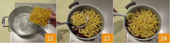 The water in the pot will now be boiling, and you can cook the pasta 22. Drain it still al dente and pour it directly into the pan with the seasoning 23 and combine it with the other ingredients 24.