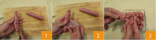 To prepare the radicchio, sausage, and smoked cheese timbale, start with the sausage preparation. Make an incision in the sausage casing 1 and gently pull it outward to remove it 2. Crumble the sausage with your hands 3 or with a fork, then set it aside in a bowl.