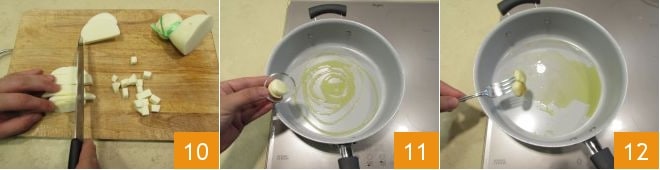 Also cut the smoked cheese into not-too-large cubes 10. Now you have all the ingredients ready for the seasoning. Heat a pot with plenty of salted water to cook the pasta. Then take a non-stick pan and brown a clove of garlic in a drizzle of oil 11. When it turns golden, remove it 12.