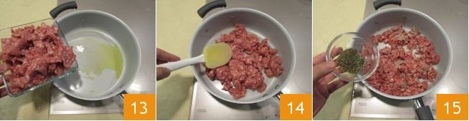Add the sausage 13 and sauté it for about 4-5 minutes over medium heat, stirring occasionally for even cooking 14. Then season with the aromatic mixture 15.