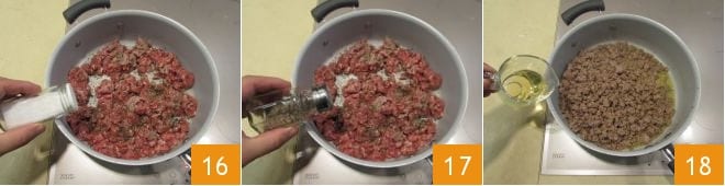 Adjust with salt 16, pepper 17, and deglaze with white wine 18. Let it cook by lowering the heat for about 10-15 minutes.