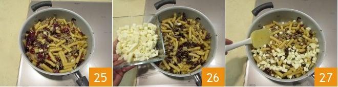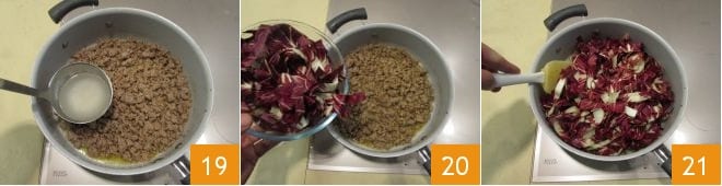 If necessary, add a ladle of pasta cooking water 19. When the sausage ragù is cooked, turn off the heat and add the radicchio 20, mixing it with the other ingredients 21.