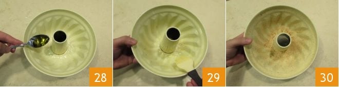 Take a bundt pan of 8.7 inches in diameter and 3.9 inches in height. Grease it 28, using a brush 29 and sprinkle it with breadcrumbs 30