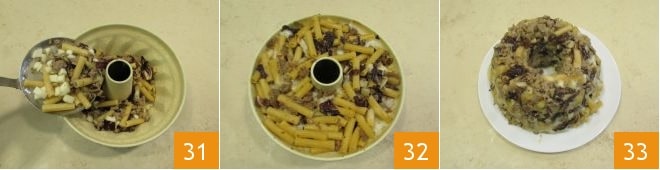 Transfer the pasta into the pan 31. Bake in a preheated static oven at 356°F for 20 minutes (if you have a convection oven, at 320°F for 10 minutes). After the cooking time, remove the pan from the oven 32. Finally, let it rest for a few minutes before unmolding your radicchio, sausage, and smoked cheese timbale onto a serving plate 33 and enjoy it while still warm!