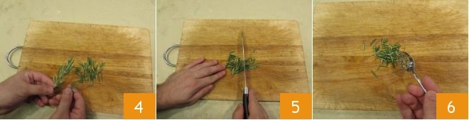 Proceed by washing and drying the rosemary well. Then remove the leaves from the sprig 4 and finely chop them with a knife 5. Add the fennel seeds 6.