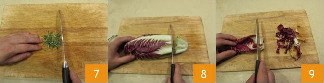 Chop everything again and set it aside 7. Proceed with the radicchio, removing the harder white part 8 and slicing it into strips 9.