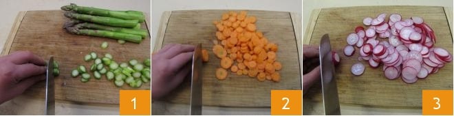 To prepare the radish omelette, start by cleaning the vegetables. Peel the asparagus and carrots and slice them into rounds (1-2), keeping the asparagus tips aside. Wash the radishes and slice them into fairly thin rounds as well 3.