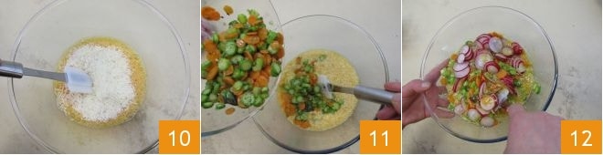 Then, add the grated cheese 10, mix well, and also add the vegetables: both the carrot and asparagus mix 11 and the sliced radishes 12.