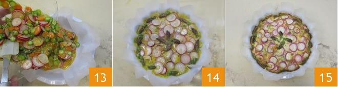 Mix the ingredients well and pour into a pan lined with parchment paper 13, decorate with the reserved asparagus tips 14, and bake at 355°F for 55 minutes 14. Serve the radish omelette warm to best enjoy the various flavors.