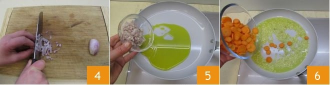 At this point, finely chop the shallot 4 and stew it with a drizzle of oil for about 5 minutes over very low heat 5, then add the carrots and let them cook for a couple of minutes 6.
