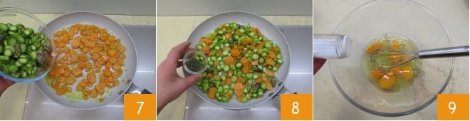 After this time, add the asparagus rounds 7 and the chopped thyme 8. Finish cooking for about 5 minutes and only at the end add salt and pepper. Let cool slightly and in the meantime, start beating the eggs in a large bowl, adding salt and pepper immediately 9.