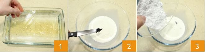 To prepare the rainbow cake, start with the yogurt cream: in a bowl, soak the gelatin sheets in cold water for at least 10 minutes 1. Meanwhile, pour 1 2/3 cups of fresh liquid cream into a small bowl, add the seeds from the vanilla bean 2 and powdered sugar 3.
