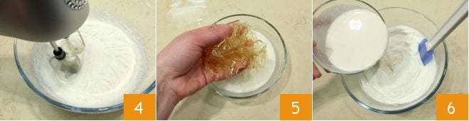 Whip the cream with an electric mixer 4; then thoroughly drain and squeeze the gelatin sheets and place them in a small bowl with 1/2 cup of previously warmed cream 5: stir with a teaspoon so that the gelatin dissolves completely. Then pour the warm cream in which you dissolved the gelatin into the bowl with the whipped cream 6, and gently mix the two with a spatula.