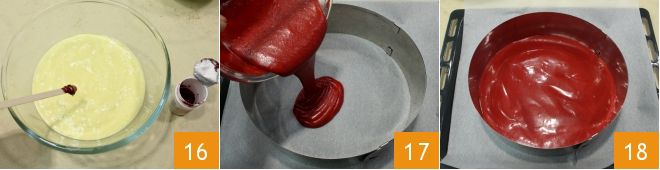Color each small bowl with gel or paste food coloring, adding it in small doses until you reach the ideal color: red 16, yellow, green, orange, purple, and blue (you can dissolve the coloring with a tablespoon of water so it blends more easily into the mixture). On a baking sheet lined with parchment paper, place a pastry ring 7 inches in diameter (you can also use a round mold of the same size) and pour the colored batter 17; bake one base at a time in a preheated oven at 390°F for about 10 minutes (if using a convection oven, 355°F for about 5-6 minutes).
