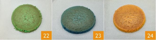 then make the other bases following the same procedure to obtain the green 22, blue 23, and orange 24 sponge cakes so that you have all the bases ready for the rainbow cake.