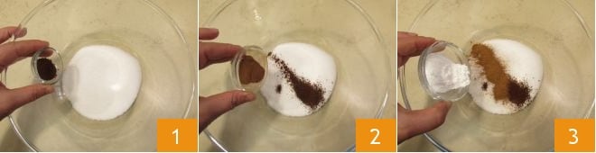 To make the Naples Copper Cookies, melt the margarine in a double boiler or microwave and set aside. Pour the sugar, cloves 1, and ground cinnamon 2 into a large bowl. Add the baking powder 3