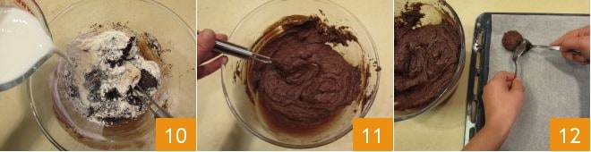 Also add the milk, alternating with the flour 10, mixing to obtain a well-blended mixture 11. Now shape the cookies: line a baking sheet with parchment paper, then take a spoonful of dough and form a ball by sliding the dough onto the tray with the help of another spoon 12; be sure to space the cookies apart because they will expand during baking.