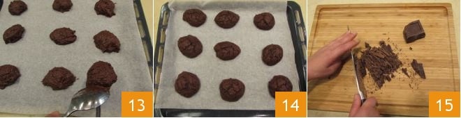 Once the cookies are completed 13, bake in a preheated static oven at 356°F for 15 minutes. Once baked, remove the cookies and let them cool 14. In the meantime, prepare the coating: chop the dark chocolate with a knife 15
