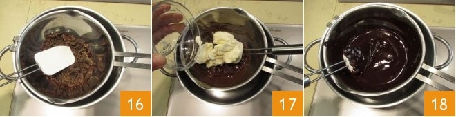 Place it in a saucepan for double boiling 16, add the margarine 17 and heat over moderate heat until the mixture has completely melted 18.