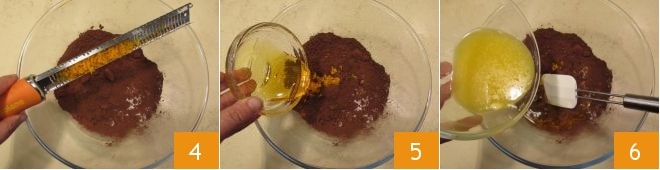 Then add the unsweetened cocoa powder and flavor the dough by grating the orange zest 4, being careful to avoid the white part of the peel, which would be bitter. Pour in the honey 5 and melted margarine 6.