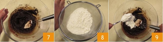 Mix the mixture with a spatula to blend it 7, separately sift the flour 8 and incorporate it into the dough, one tablespoon at a time 9.