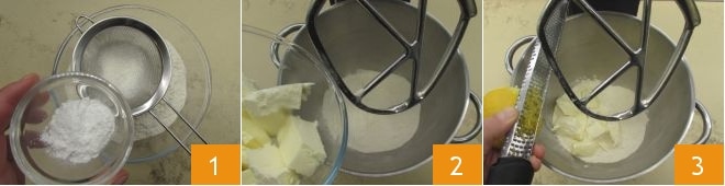 To make the raviole, first sift the flour and baking powder through a sieve 1, then pour the powders into the bowl of a stand mixer fitted with a paddle attachment, add the butter 2 cut into pieces, flavor with grated lemon zest 3, and turn on the machine to obtain a sandy mixture,