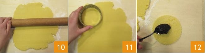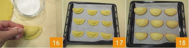 Then sprinkle them with sugar 16 and place them on a baking tray lined with parchment paper 17. Bake in a preheated static oven at 340°F for 20 minutes on the middle shelf. Take the raviole out of the oven and let them cool 18.