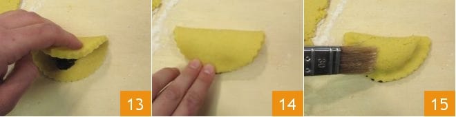 Fold each raviola in half to form a half-moon 13 and press the edges to adhere the ends 14. Brush the surface of the sweets with milk 15