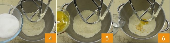 add the sugar 4, mix again, and then pour in the eggs 5 and milk 6.