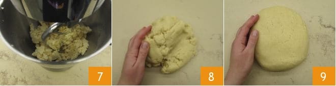 Knead again until a uniform mixture is obtained 7, transfer it to a pastry board 8, and work it by hand to form a dough ball 9, cover it with cling film, and let it rest in the refrigerator for at least 6 hours.