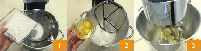 To prepare the potato ravioli, start by making the egg pasta. You can refer to the procedure from the Cooking School: Homemade pasta (sheets and shapes). In the bowl of a stand mixer, sift the flour 1 and add the eggs 2. Mount the K-beater and mix at medium-high speed to create a homogeneous and soft dough 3.