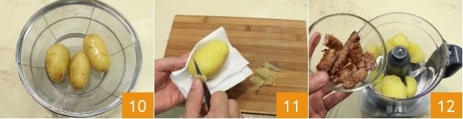 When the potatoes are cooked, drain them 10 and let them cool slightly. Then transfer them to a cutting board to peel, using a kitchen towel or cloth to avoid burning yourself 11. Once peeled, slice them and place them in a blender. Add a pinch of salt and the roasted sausage pieces 12.