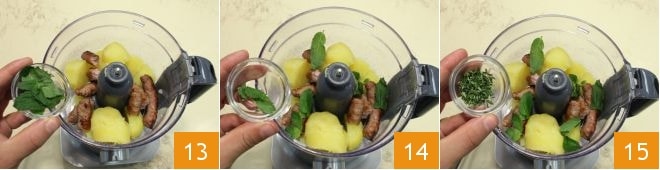 Add parsley 13, mint leaves 14, and thyme 15 to the other ingredients,