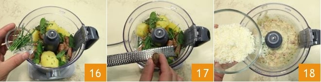 then also add chives 16 and a grating of nutmeg 17. Blend until you have a smooth cream, then add the grated Grana Padano cheese 18. Blend until creamy and homogeneous.