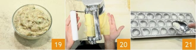 Transfer the filling to a small bowl 19 and keep it cool. Meanwhile, after the necessary time, take the egg pasta ball from the refrigerator, divide it in half, and roll out one half with a rolling pin, then use a pasta roller to make a very thin sheet 20. Flour a small ravioli mold 21 (if you don't have one, you can simply lay the sheet on a surface)