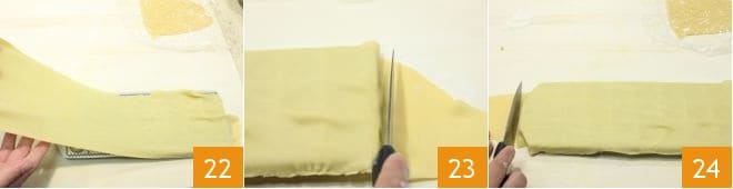 spread the sheet over the mold 22 and trim the excess dough with a small knife (23-24),